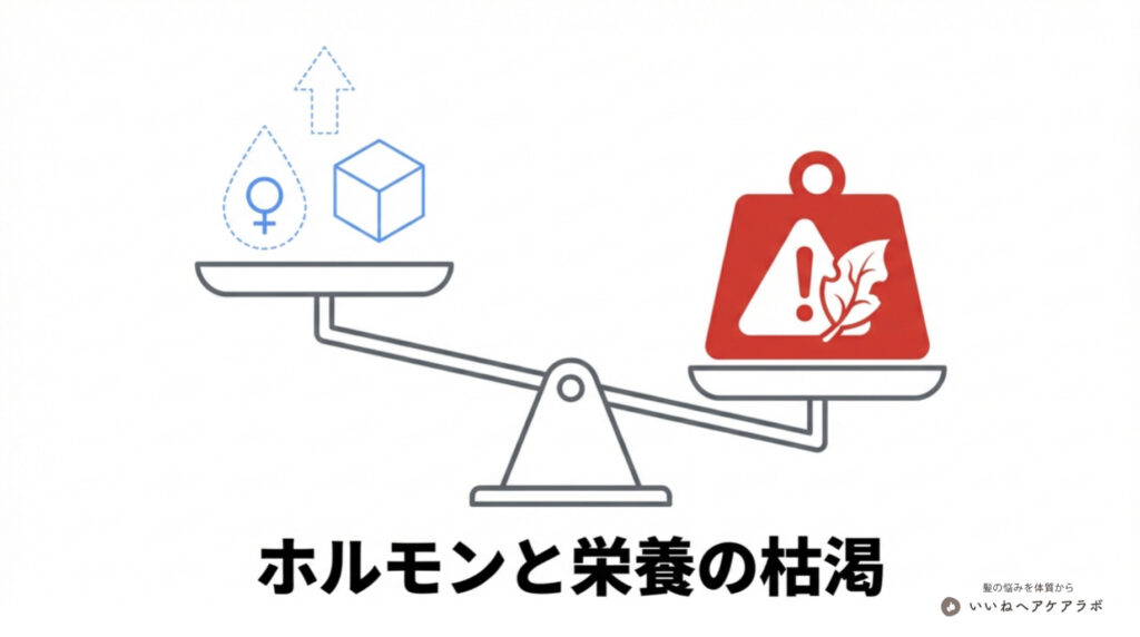 - 抜け毛のサイクル加速: 毛根が栄養不足に耐えられず、成長途中の髪が抜け落ちる「休止期脱毛」を引き起こします。