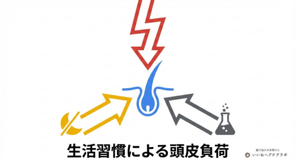 - 微小循環の悪化: 髪を作る工場である毛母細胞が酸素・栄養不足になり、製造ラインがストップします。