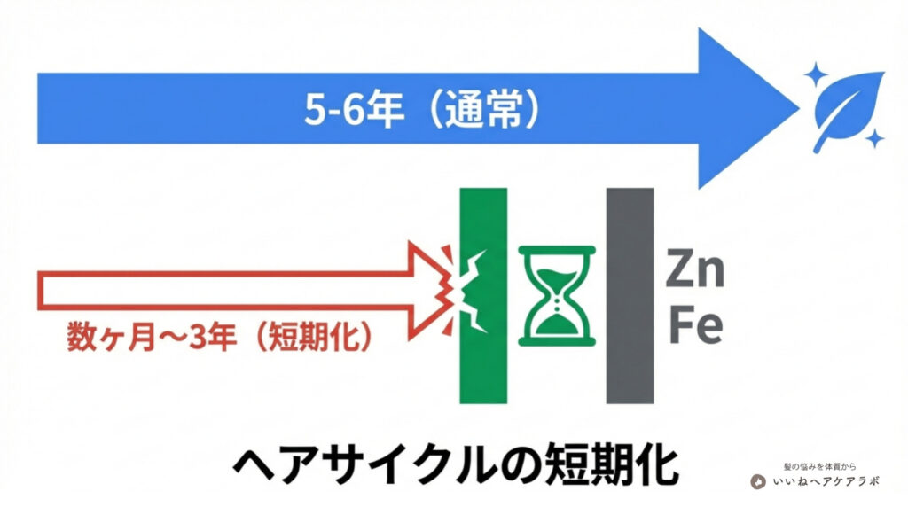 - フェリチン値の影響: 貯蔵鉄(フェリチン)が少ないと、体は髪への栄養供給を後回しにします。
