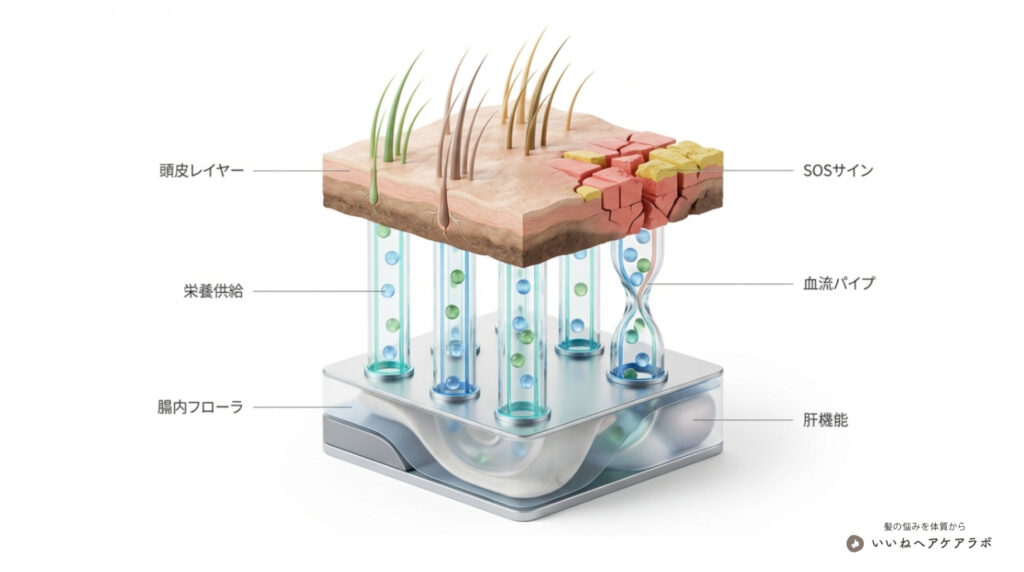 - 頭皮の「砂漠化」: 空調による乾燥でバリア機能が低下し、刺激に弱くなった頭皮は髪を育てる力が衰えます。