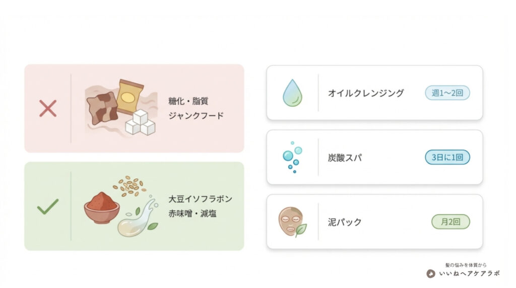 - ● 高GI食品の摂りすぎによる糖化(ベタつく地肌と細い髪の直接的な原因)。