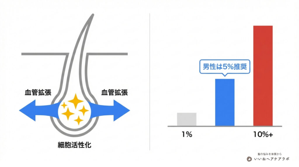 - 継続性への寄与: 5%以上の高濃度(海外製10%以上など)は、効果の劇的な向上よりも、頭皮のかぶれや炎症といった副作用リスクの方が先に高まる傾向にあります。