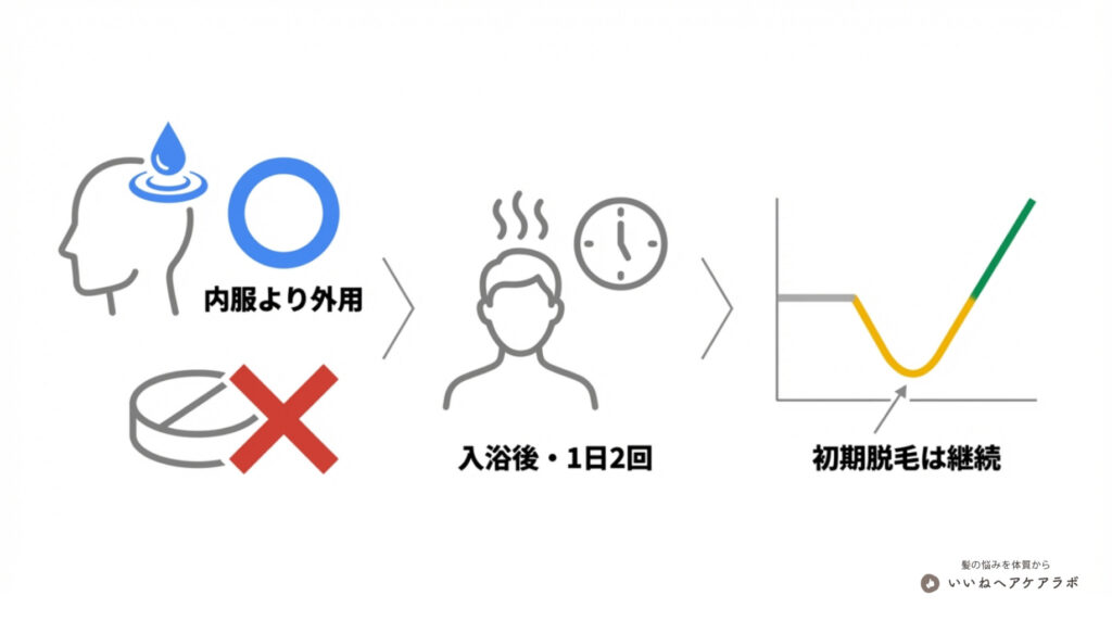 - ● 外部ケア: ミノキシジルを1日2回、正しいタイミングで塗布し、発毛を促進する。