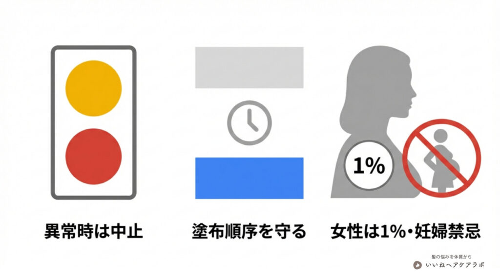 - 許容範囲の反応: 塗布直後のごく軽いかゆみや、わずかな赤みであれば、頭皮が成分に慣れるまで数週間様子を見ることが可能です。