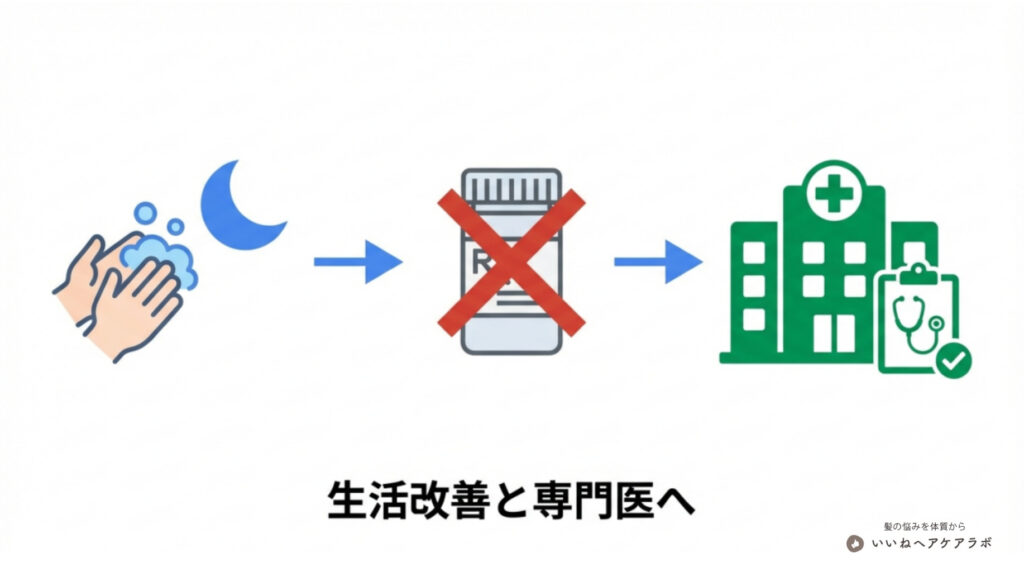 シャンプーはあくまで頭皮環境を整える補助的なものです。甲状腺疾患や貧血、AGAなどが原因の場合、医療機関での適切な治療(投薬など)が不可欠です。