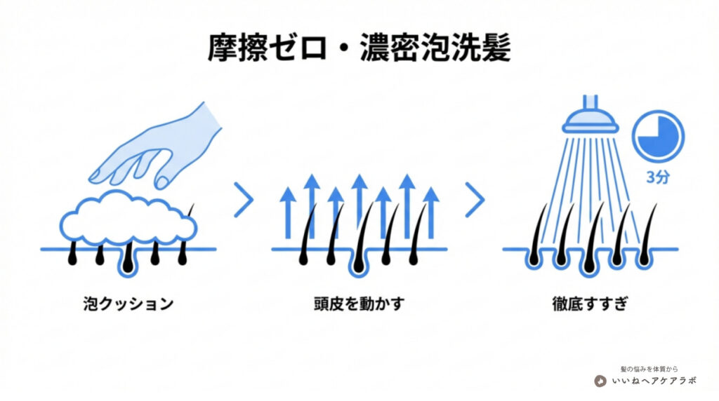 この一手間をかけるだけで、界面活性剤が空気と混ざってマイルドになり、洗浄力が最適化されます。また、泡がクッションになるため、指と頭皮の間の摩擦が激減し、抜け毛予防につながります。