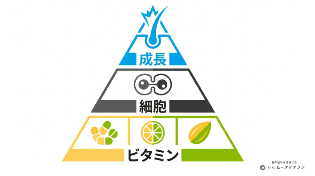 特にビタミンB群、ビタミンC、ビタミンEは「髪の三大ビタミン」とも言われ、それぞれが異なるアプローチで頭皮と髪をサポートします。これらをバランスよく摂取することで、毛母細胞の活性化を促し、びまん性の悩みを根本からケアすることができます。