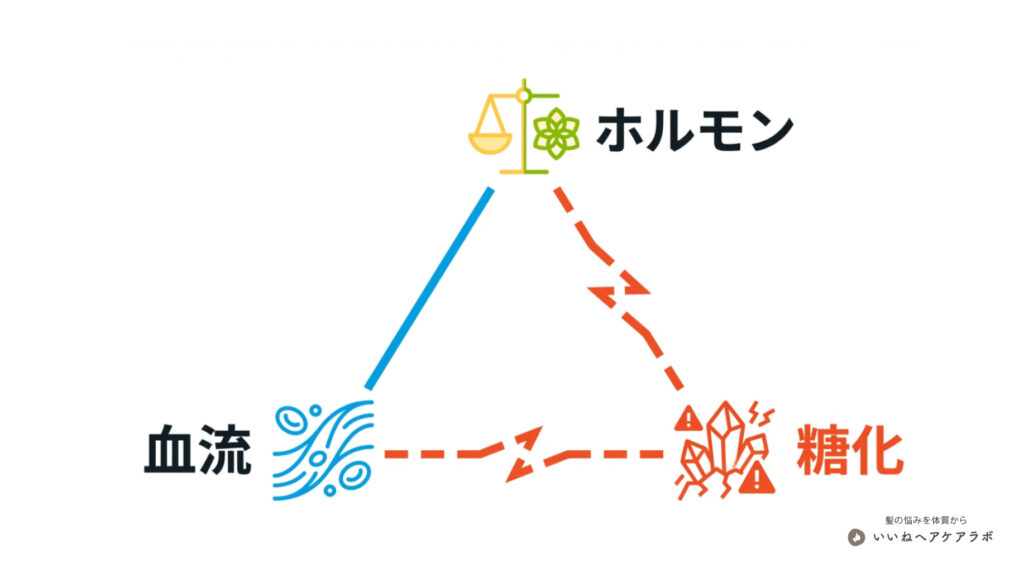 - 血管の老化: 糖化産物(AGEs)が血管を傷つけ、血流を悪化させます。毛根に栄養が届かなくなる直接的な原因です。
