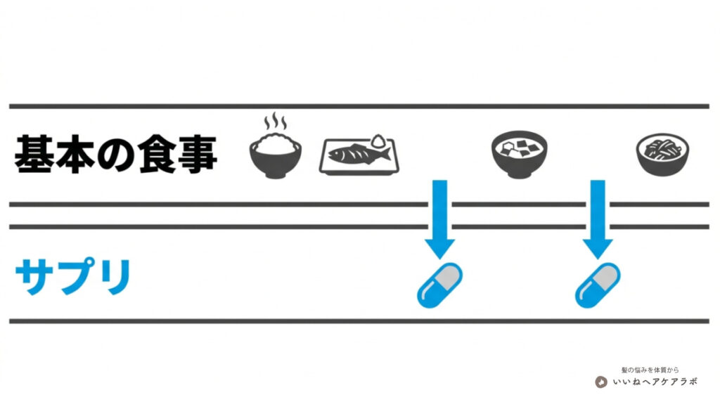 理想はすべての栄養を食事から摂ることですが、現代社会において完璧な献立を毎日維持するのは容易ではありません。そこで有効なのが「サプリメントの活用」です。サプリメントはあくまで「補助」ですが、食事だけではどうしても不足しがちな亜鉛やビタミンB群、鉄分などをピンポイントで補える大きなメリットがあります。