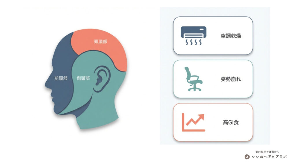 東京のオフィスは一年中空調が効いており、冬場だけでなく夏場も冷房による乾燥が激しいのが特徴です。乾燥した頭皮はバリア機能が低下し、炎症を起こしやすくなります。これが「頭皮環境の悪化=抜け毛」の直接的なトリガーになります。