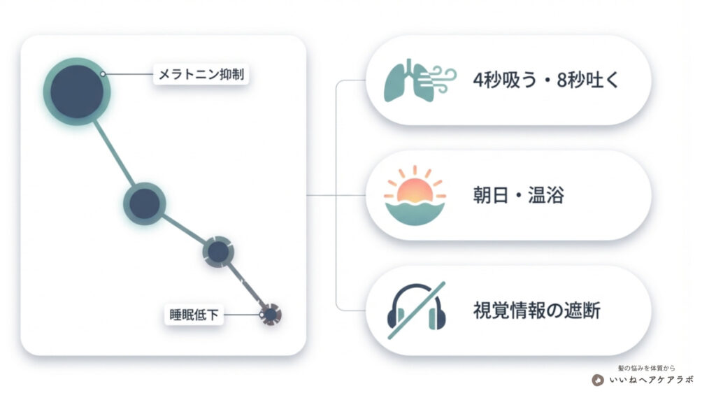 - ● 朝の太陽光: 起床後すぐ日光を浴び、セロトニンを分泌させて夜のメラトニン生成を予約する。