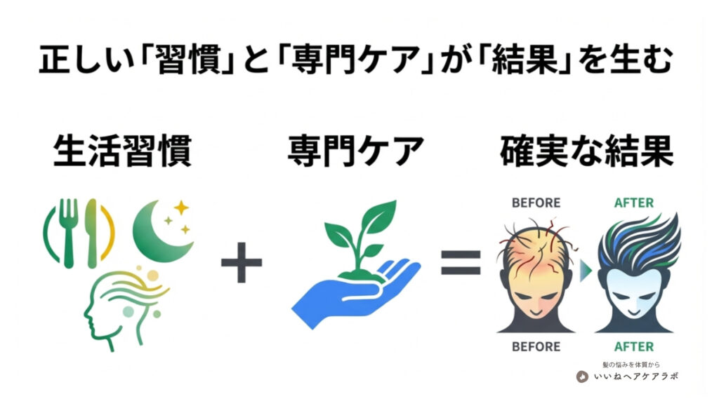 専門サロンで薬を使わずに確かな結果を出す方々には、驚くほど共通した特徴があります。それは、単にサロンに通うだけでなく、自らの身体を「髪が育ちやすい体質」へと能動的にアップデートしている点です。薄毛の悩みから解放されるプロセスは、実は日々の小さな選択の積み重ねに他なりません。