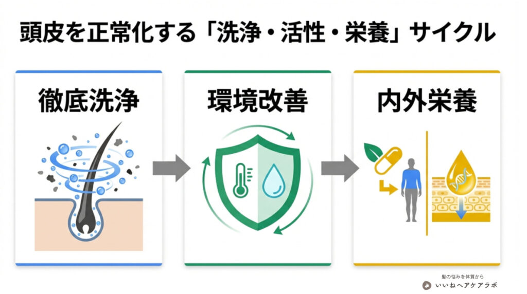 - ● 糖化を防ぐ食事法: 過剰な糖分摂取は頭皮の老化(硬化)を招きます。タンパク質と抗酸化食品を優先的に摂取しましょう。